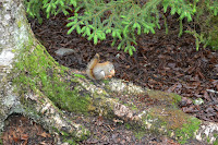 We hoped to arrive at our campsite in Fundy National Park around 5pm, but as seemed to be the trend of the trip, the travel time took way longer than we expected. We didn't get to our site in Point Wolfe Beach until 8:45pm. At this point, the roads were dark, windy and foggy... and it was kinda intense. Of course, our first night of camping on the trip and we had to set up in the dark and the rain. To top it all off, we killed our car battery by using the headlights to set up. Gah... It was a rough start. BUT, the camping gods showed us mercy... in the morning the sun came out and the car started with only a few groans. During breakfast Jan made a squirrel friend who he named Joshua - things were looking up!
